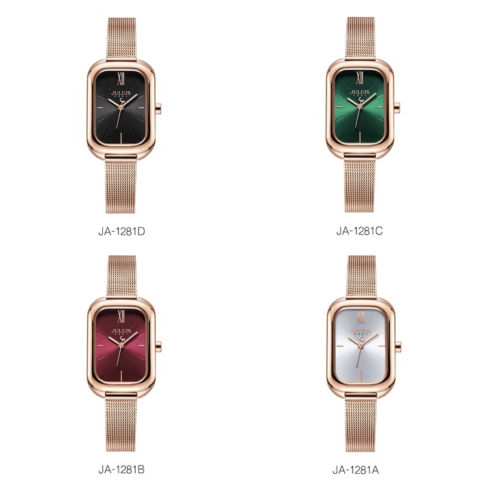 นาฬิกา Julius JA-1281 สีพิ้งโกล หน้าปัดเหลี่ยม สุดปัง ของเเท้ ส่งฟรี มีบริการเก็บเงินปลายทาง ✓งานแบรนแท้ ✓บอกเวลา ✓กันน้ำได้ 30M ✓สายสแตนเลสอย่างดี ✓สินค้าของแท้มีใบรับประกัน 1 ปี ✓ เส้นผ่าศูนย์กลางตัวเรือน 2.4 เซนติเมตร