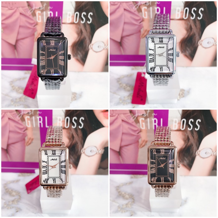 นาฬิกา Mishali Mi-19033 สายสเเตนเลส หน้าปัดเหลี่ยม สีพิ้งโกล ของเเท้ พร้อมกล่องแบรน ถุงแบรน